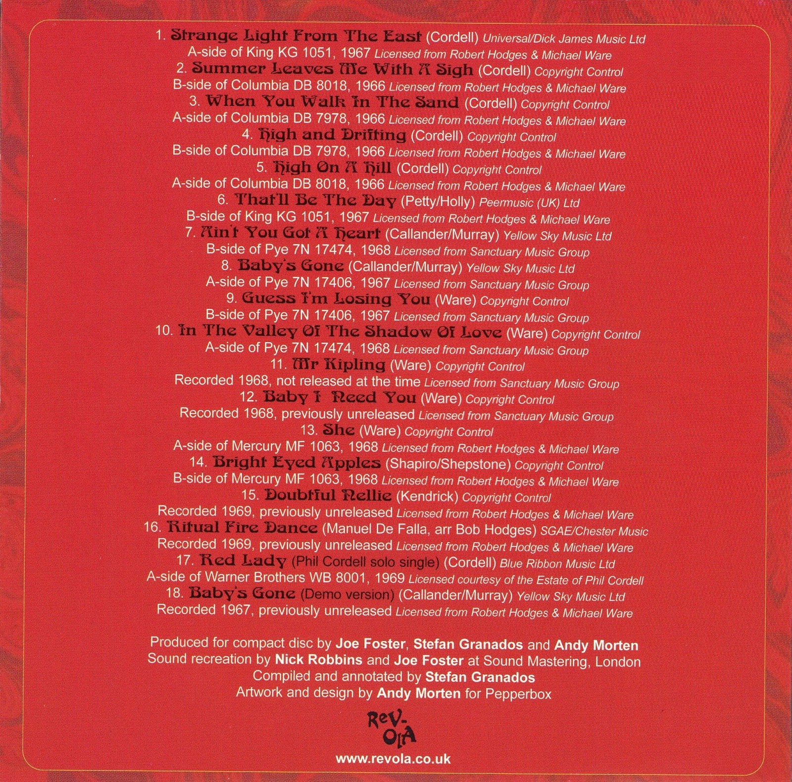 They did write much of their own material, and the passable British pop/rock period sounds of this CD range from light trendy psychedelia ("Strange Light from the East," "In the Valley of the Shadow of the East") to Beatlesque mod rock ("Summer Leaves Me with a Sigh," "High and Drifting"), Walker Brothers-lite ("When You Walk in the Sand"), Baroque pop-folk ("High on a Hill"), a heavy psych adaptation of a Spanish ballet ("Ritual Fire Dance"), and good-time vocal harmony-driven pop with an American influence.